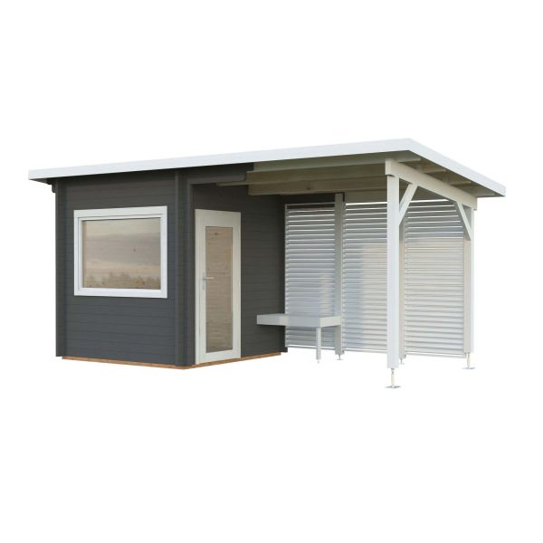 Den mysiga sittbänken utanför erbjuder en trevlig plats där du kan svalka dig efter sessionen i bastun och ta en kort paus samtidigt som Louvre-panelen ger avskildhet.