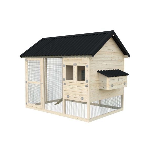 Hönshuset Chick från Palmako består av utedelen där dina höns har en skugga både från regn och sol, sovplatsen som är ovan mark dit hönsen kan gå fritt via rampen. Värpreden har inspektionlucka på utsidan. Metalltak ingår.