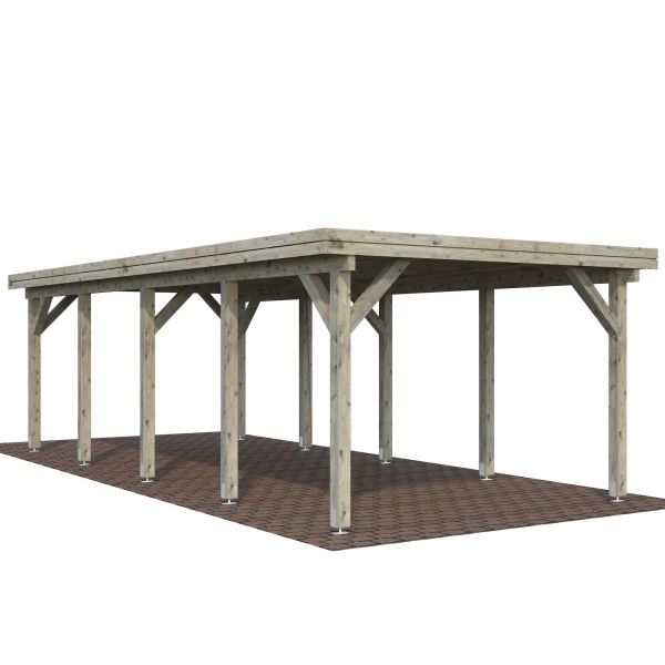 Karl är en carport med plats för en bil i bredd. Det flacka taket ger denna carport ett modernt uttryck som passar in i både anrika villaområden och nybyggen. Den kraftiga konstruktionen med sex rejäla stolpar och tak av spontade brädor gör carporten stabil och hållbar. Karls tak skyddar bilen från kyla och snö och ser till att du slipper skrapa fram din bil på kalla vinterdagar. På sommaren skyddar taket bilen från solen och ger dig en behagligt sval bil. Ett perfekt alternativ eller komplement till ett garage. Utrymmet längst bak på carporten gör det möjligt att komplettera med ett förråd. Ett platssmart extrautrymme för förvaring av uteredskap, trädgårdsmöbler, bildäck, etc.
