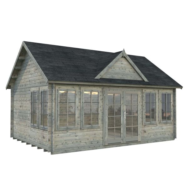 Stugan Claudia från Palmako har ett generöst ljusinsläpp genom åtta fönster och helglasad dubbeldörr. Som dekoration har stugan en takkupa med sadeltak.