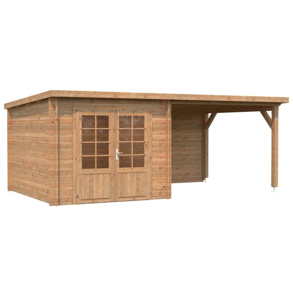 Stugan Ella från Palmako har en perfekt kombination av förvaring både inne och ute. Det flacka taket och raka linjerna skapar ett modernt uttryck och blir ett stilfullt inslag i din trädgård. Ella har en öppen del som enkelt kan göras till en mysig uteplats. Samtidigt har Stugan Ella flera praktiska fördelar som exempelvis förvaring både utomhus under tak och helt inomhus. Stugan knuttimras med 28 mm tjocka väggar och kan byggas med förrådsdelen antingen höger- eller vänsterställd. Kombinera gärna med väggpaneler.