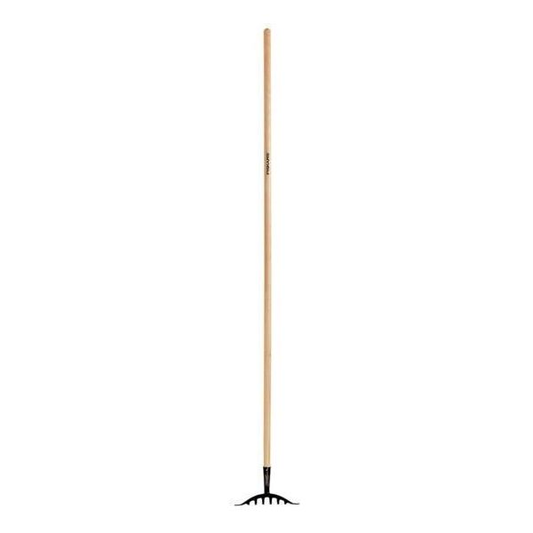 Fiskars 5245 är en 1735x24 mm roskratta med 10 böjda pinnar träskaft och huvud i härdat stål.