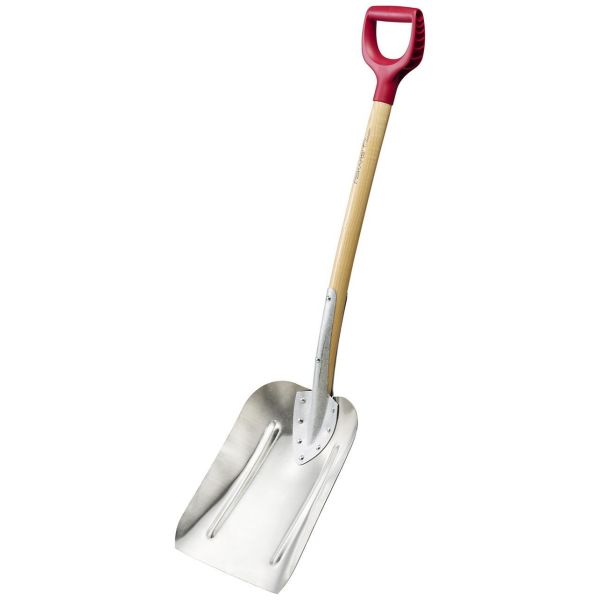 Fiskars 142030 är en snöskyffel med träskaft, y-handtag och blad i härdad aluminium.