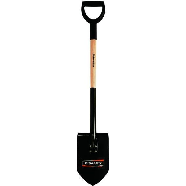 Fiskars 243 är en lång spetsig spade för villa och trädgård. Med lackerat träskaft, ergonomiskt plasthandtag och blad i härdat stål.