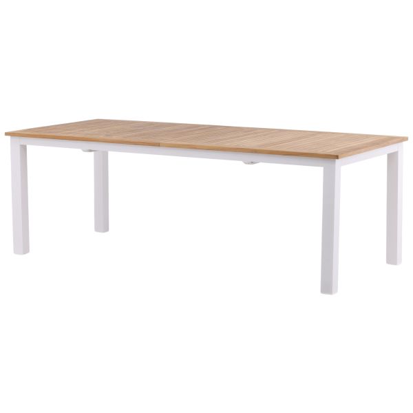 Panama 9396-400 är ett stilrent, modernt och tidlöst matbord. Förlängningsbart bord i rektangulär form. Bordsskivan är i vacker teak och underredet i vit metall. Den praktiska storleken gör att bordet fungerar perfekt för både små och stora sällskap så gör dig redo för härliga middagsbjudningar på uteplatsen i sommar.