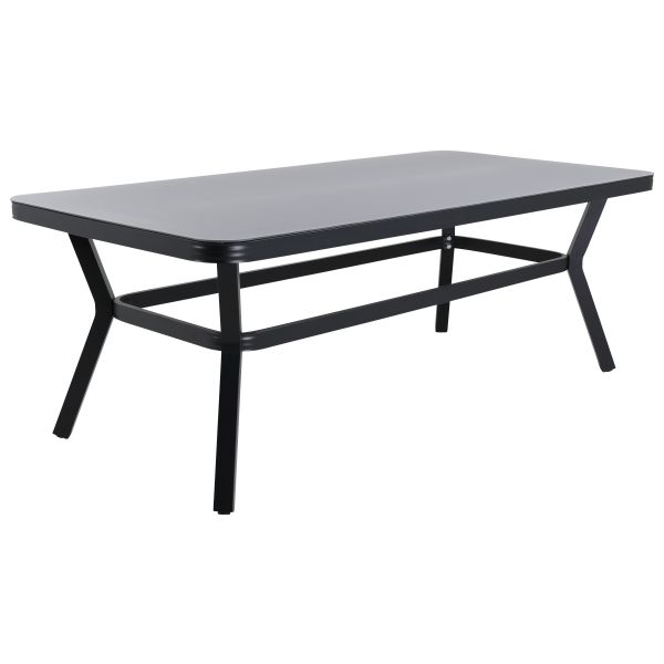Virya 1464-408 är ett läckert matbord med en bordsskiva i glas och bordsben i svart aluminium. Med dess hållbara material och stilrena uttryck passar matbordet lika bra ute på altanen som ute i trädgården.