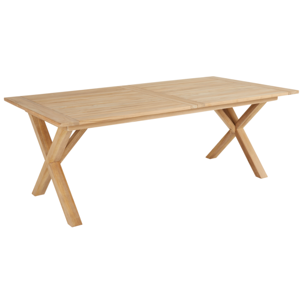 Brutus – ett stabilt bord i teak med kryssben. Två meter långt i grundutförandet – ett mått som du med den praktiska inbyggda butterfly-funktionen snabbt kan förlänga till 2,65 meter. Justerbara fötter.