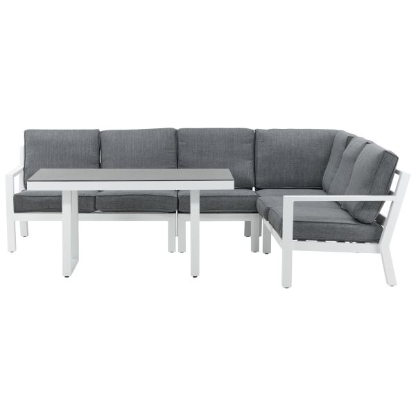 Barcelona 1029-400 är ett loungeset med en soffa och ett soffbord. Skapa en charmig mittpunkt att samla familj och vänner kring på uteplatsen. Barcelona Soffgrupp är en skön och snygg grupp i vit aluminium med tillhörande bord som matchar med en toppskiva i glas. Slitstarka dynor i svart kulör ingår. Ingen montering krävs. Duka ut eftermiddagsfikat och njut – här sitter ni bekvämt och avkopplat i timmar.