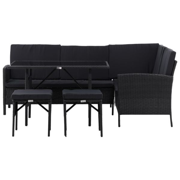 Knock 2046-201 är ett loungeset med en soffa, två sittpallar och ett soffbord. Knock soffgrupp passar utmärkt till din uteplats eller altan och är skapad med fokus på komfort och tidlös deisgn. Soffgruppen består av en hörnsoffa i svart konstrotting med fyra sittplatser och en hörndel, två sittpallar samt ett högre bord i konstrotting med en bordsskiva i glas. Svarta dynor inkluderas till soffgruppen och bidrar till en inbjudande känsla.
