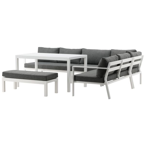 Perfekt för en fika eller varför inte läsa en bok i solen. Stommen är i vitlackerad aluminium och med dynor i grått.