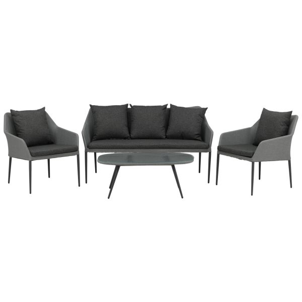 Inkluderat i gruppen är också svarta mjuka dynor samt ett ovalt lågt soffbord med en bordsskiva i klarglas som skapar en exklusiv helhet. Njut av bekväma sommarkvällar i en trivsam soffgrupp.