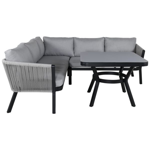 Virya 1463-408 är ett loungeset med en soffa och ett soffbord. Virya är en modern soffgrupp, med inriktning på komfort och design som garanterat kommer göra succé på uteplatsen i sommar. Möbelgruppen består av en hörnsoffa tillverkad i en slitstark design i svart pulverlackerad metall med en rygg som är designad i ljusgrått rep, samt ett rektangulärt högt soffbord med en bordsskiva i grå finish som matchar repen och dynornas nyans och skapar en exklusiv helhet. Mjuka, ljusgrå dynor ingår till soffgruppen.