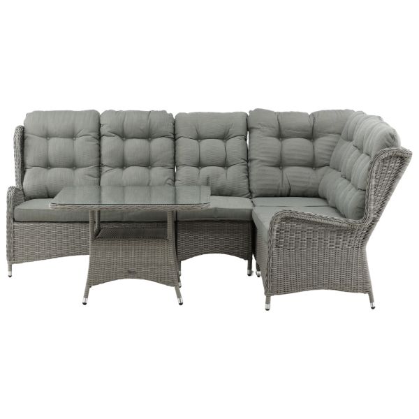 Washington 8189-751 är ett loungeset med en soffa och ett soffbord. Washington är ett exklusivt loungeset med en kombination av tidlös design och en fantastisk komfort, den kommer garanterat göra succé på din uteplats eller altan i sommar. Soffgruppen består av en hörnsoffa med sex sittplatser och en hörndel samt ett högre soffbord med en avlastningshylla och en bordsskiva av glas. Tillverkat i ljusgrå konstrotting med en aluminiumstomme. Mjuka, tjocka, ljusgrå pickerade dynor ingår till soffgruppen. Njut av sena sommarkvällar på bästa sätt.