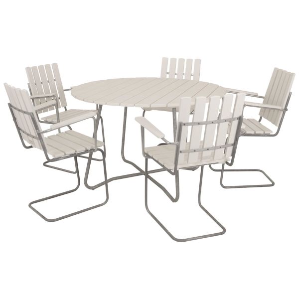 Matgrupp med runt bord och fem fåtöljstolar i klassisk serie som Eden Wood har tillverkat i mer än 40 år. Alla möbler i serien har samma bakomliggande tanke: komfort, design och funktionalitet. Den stilrena designen, och de bekväma möblerna skapar ro för både kropp och själ. Slå dig ned och känn efter, så förstår du. Trädetaljerna i möblerna är tillverkade i norrländskt furu, som är FSC-certifierat. FSC uppmuntrar till miljöanpassat, samhällsnyttigt och ekonomiskt livskraftigt bruk av världens skogar. Bordsstativen är gjorda i svenskt 25 mm rör som är varmgalvade. Bordsskivan består av planhyvlat 25×100 mm virke.