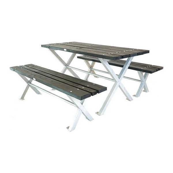 Matgrupp med bord och två bänkar för åtta personer. Bord och bänkar i svenskt FSC-märkt kärnfuru från Norrland. Ben i varmgalvaniserat 50x50 mm stål.