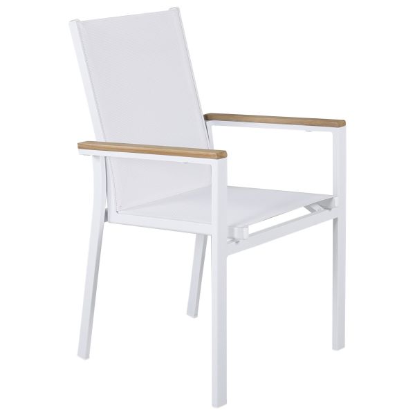 Texas 9291-400 är en karmstol likväl som matstol i skandinavisk design. De raka nordiska formerna ger dig en stilren stol som passar till alla tillfällen. Tillverkad i vit aluminium med en sits i textilene. Armstöden är dekorativa i teak vilket skapar en smakfull detalj. Stolen är stapelbar, för smidig förvaring. En slitstark stol som garanterat kommer göra succé på altanen i sommar.
