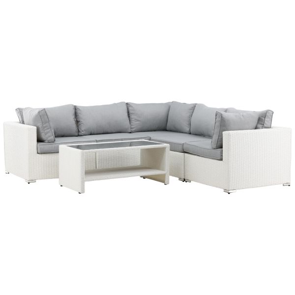 Amazon 9140-010 är ett loungeset med en soffa och ett soffbord. Amazon Soffgrupp imponerar med sin moderna design som har fokus på en god komfort till din uteplats eller altan. Soffgruppen består av en hörnsoffa i modulform med fyra sittplatser och en hörndel som går lätt att bygga ihop för att passa dina behov. Mjuka mörkgrå mjuka dynor inkluderas samt ett matchande, lägre soffbord med en bordsskiva av glas. Tillverkat av en metallstomme och vit konstrotting, två slitstarka material som lämpar sig utmärkt för utomhusbruk. Gör er redo för ett enastående uteliv.