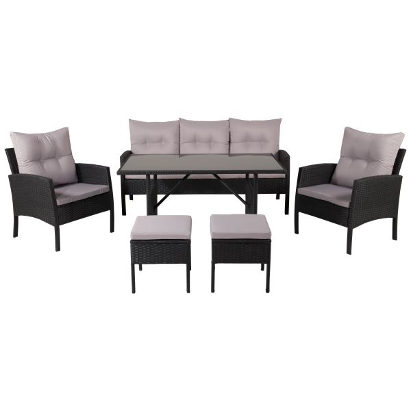 Knock 1527-201 är ett loungeset med en soffa, två fåtöljer, två sittpallar och ett soffbord. Knock skapar ett inbjudande blickfång till din uteplats. En modern mångsidig soffgrupp i svart konstrotting som passar utmärkt både till altanen eller uterummet. Soffgruppen består av en tresits soffa, två karmfåtöljer samt två pallar, inklusive gråa pickerade mjuka dynor samt ett rektangulärt matbord med en bordsskiva av svart glas. Lättare montering krävs.