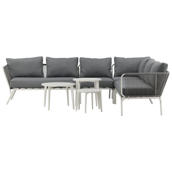 Roxo 9151-018 är en loungeset som består av en soffa och tre satsbord. Skapa en mysig plats att samla nära och kära kring i sommar, här sitter ni avkopplat och bekvämt i timmar. Roxo är en trendig soffgrupp i stilren design som passar utmärkt till uteplatsen eller uterummet. Soffgruppen består av en hörnsoffa med fem sitsplatser och en hörndel, tillverkat i en slitstark design i vit pulverlackerad metall med en rygg som är designad i ljusgrått rep samt stilrena satsbord i tre delar i vit pulverlackerad metall. Grå mjuka dynor ingår till soffgruppen.