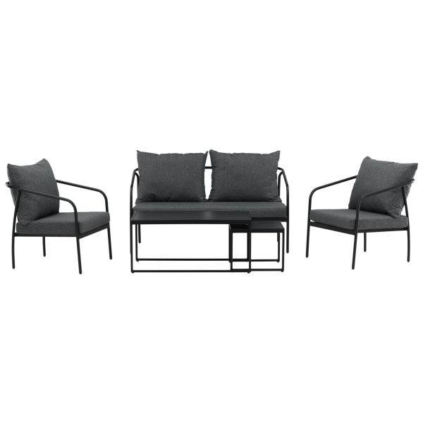 Sopot 2044-408 är ett loungeset som består av en soffa, ett soffbord och två fåtöljer. Kombinerar stilren design med hög komfort. Skapar den perfekta stämningen på din altan. Två Sits-soffan och fåtöljerna har raka nordiska former med stomme av svart stål och ett matchande soffbord ingår. Möblera uteplatsen med en inbjudande soffgrupp och få den klockrena loungegruppen.