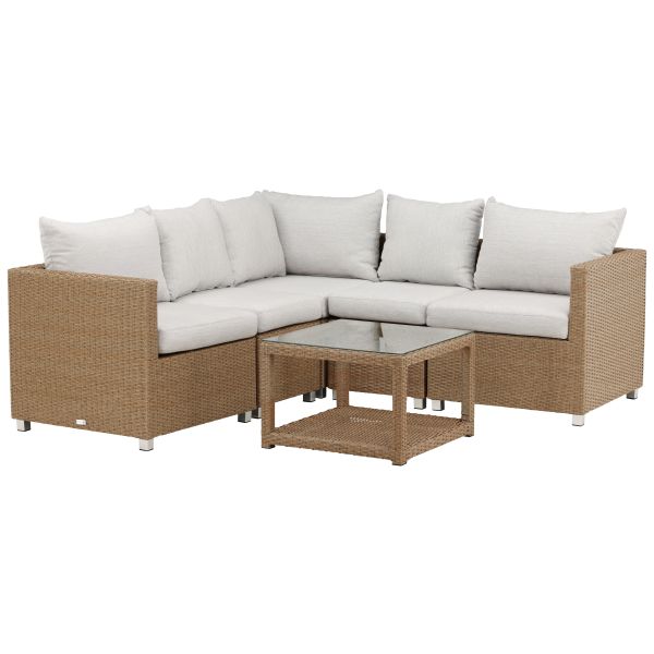 Vamos 9612-007 är ett loungeset som består av en soffa och ett soffbord. Loungeset som imponerar med sin lyxiga, avkopplade design och raka nordiska former. Den här soffgruppen i modern design har fokus på en god komfort till din uteplats eller altan. Soffgruppen består av en hörnsoffa med fyra sittplatser och en hörndel. Inklusive vita mjuka dynor samt ett lägre soffbord med en avlastningshylla och en stilren bordsskiva av glas. Loungesetet är tillverkat av en metallstomme och naturfärgad konstrotting. Moduler finns att köpa till. Gör er redo för ett enastående uteliv.