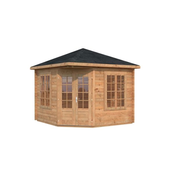 Lusthuset är tillverkat i långsamtväxande nordisk gran, ett hållbart material med hög kvalitet och särskilt anpassat för de svenska tuffa väderförhållandena. Att knuttimra är det mest traditionella sättet att bygga stugor och har fortfarande många fördelar som exempelvis att du helt slipper skruvar och spik för att bygga ihop väggarna. En teknik som är enkel även för dig helt utan byggerfarenhet. Stugan levereras i delar som knuttimras ihop och med alla nödvändiga fästelement inkluderade. Alla övriga detaljer är färdigkapade vilket gör den enkel att bygga ihop på rätt sätt. Dubbeldörrarna levereras komplett med dörrhandtag och lås.