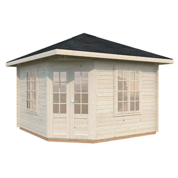 Lusthuset är tillverkat i långsamtväxande nordisk gran, ett hållbart material med hög kvalitet och särskilt anpassat för de svenska tuffa väderförhållandena. Att knuttimra är det mest traditionella sättet att bygga stugor och har fortfarande många fördelar som exempelvis att du helt slipper skruvar och spik för att bygga ihop väggarna. En teknik som är enkel även för dig helt utan byggerfarenhet. Stugan levereras i delar som knuttimras ihop och med alla nödvändiga fästelement inkluderade. Alla övriga detaljer är färdigkapade vilket gör den enkel att bygga ihop på rätt sätt. Dubbeldörrarna levereras komplett med dörrhandtag och lås.