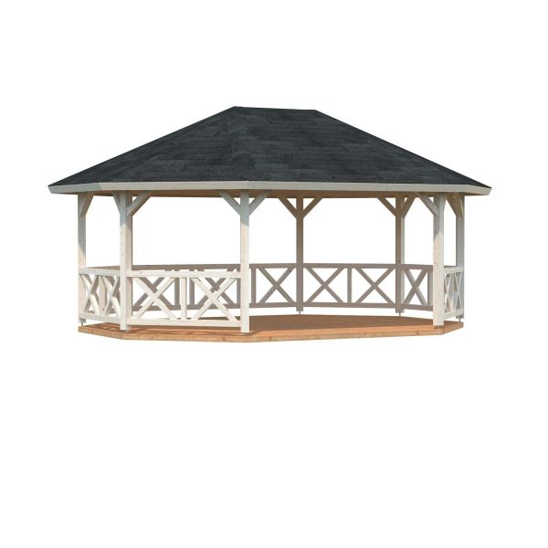 Paviljongen ringas in av ett klassiskt kryssräcke och blir en komplett härlig uteplats där taket skyddar från för mycket sol. Paviljongen är tillverkad i limträ vilket gör att den behåller sin form och stabilitet. Det ger dessutom paviljongen en slät och fin yta som minimera risken för stickor. Paviljongen levereras i delar som enkelt monteras ihop och med alla nödvändiga fästelement inkluderade. Alla övriga detaljer är färdigkapade vilket gör den enkel att bygga ihop på rätt sätt.