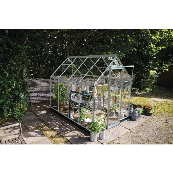 Halls ICON 6 är ett fristående växthus som kombinerar klassisk design med moderna funktioner. Den bekväma takfotshöjden på 149 cm och den totala nockhöjden på 235,3 cm ger bättre rörelsefrihet och plats för högre växter. Den låga tröskeln gör det enkelt att komma in – även med planteringslådor eller verktyg. Den enkla skjutdörren och det integrerade takfönstret säkerställer effektiv ventilation och ett hälsosamt odlingsklimat.