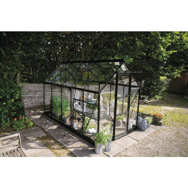 Denna modell är 6,1 m² – men om du letar efter ett mindre växthus finns ICON 6 i tre mindre storlekar: 2,5 m², 3,7 m² och 4,9 m². ICON 6 finns i aluminium, svart eller grönt. På så sätt smälter det harmoniskt in i alla trädgårdar och imponerar med sin robusta och klassiska design.