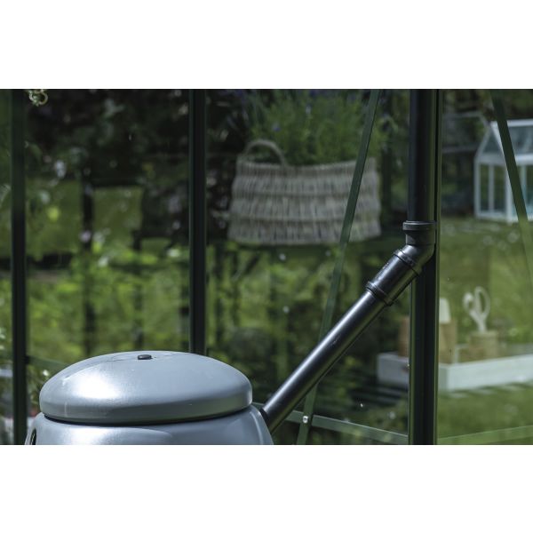 Med Halls anslutningskit kan du använda regnvattnet effektivt. Kitet kopplar växthusets hängränna till en regnvattentunna och leder vattnet snyggt dit du behöver det.