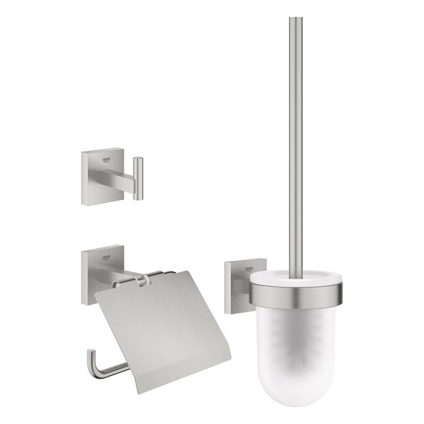 Grohe Start Cube är ett WC-tillbehörsset i 3 delar med rostfri look och är enkelt att montera. Det praktiska allroundsetet inkluderar en toalettpappershållare, krok för badrock och toalettborste. Tillverkade av fint material, byggt för att hålla, och det dolda monteringssystemet ger en vacker finish som ser professionell ut. De har alla Grohes hållbara, lättrengörande Long-Life Shine PVD-beläggning som är tio gånger mer reptålig än krom och ser fläckfri ut i många år. Alla delar är enkla att montera. De kan skruvas fast med skruvar och pluggar (ingår) eller, för en ännu bekvämare lösning, limmas. Allt du behöver är Grohe QuickGlue, som säljs separat (för en monteringsplatta, 41127000).