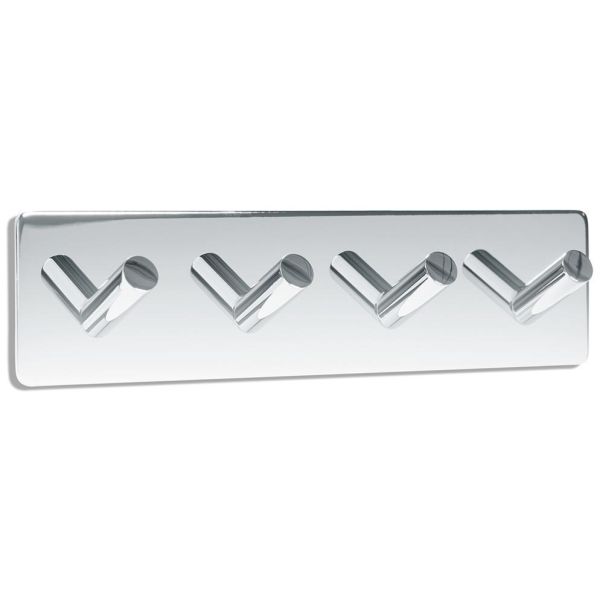 Handdukshängare med 4 stycken krokar i minimalistisk, rostfri krom. För väggmontage med självhäftande tejp 3M.