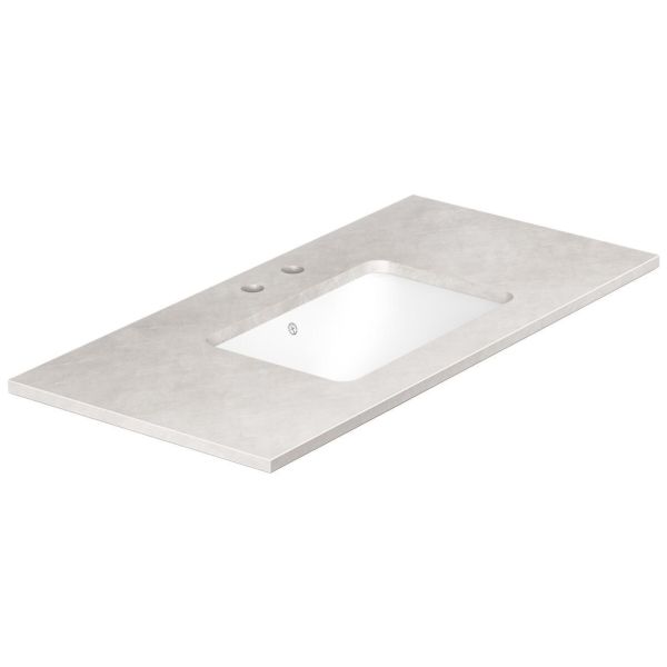 Art.nr: 4076308Grå bänkskiva i kompaktsten med underlimmad ho i porslin, passar Ducentic-kommoder. Skivan har en bredd på 100 cm och två blandarhål för en dubbelhålsblandare.