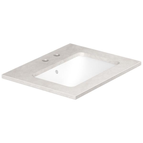 Grå bänkskiva i kompaktsten med underlimmad ho i porslin, passar Ducentic-kommoder. Skivan har en bredd på 60 cm och två blandarhål för en dubbelhålsblandare.