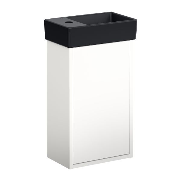 Gustavsberg Artic Small tvättställsskåp i färgerna vit/svart. Skåpet har en dörr med Soft Close för mjuk stängning samt öppning för avlopp mot golv. Ho till höger.