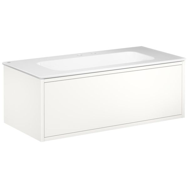 Kommod i Ducentic-serien från Gustavsberg som kan kombineras med tvättställ i porslin eller stenbänkskiva med benställning som tillval. Tvättstället har två blandarhål för en dubbelhålsblandare.