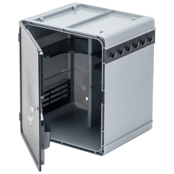 Art.nr: 3040034Medicinskåp i rökfärgad/silver plast. Monteras i städskåp.