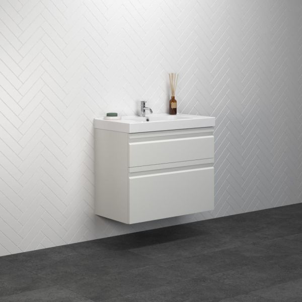 Art.nr: 3124048Ett 81x45 cm tvättställ i vit porslin och tvättställskåp med lådor.
