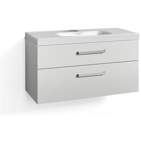 Svedbergs Signum 270310 är ett tvättställsskåp med tvättställ och lådor. Underdel med 2 lådor. Vit, fuktskyddad spånskiva.