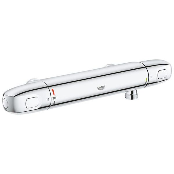 Grohe GRT 1000 Cosmopolitan är en duschblandare för väggmontage med keramiskt överstycke 1/2", 180°. Blandaren är försedd med Grohe TurboStat-tekniken som gör att termostaten sekundsnabbt ställer in önskat temperatur på vattnet, detta innebär att inget vatten går till spillo i väntan på att önskad temperatur är uppnådd. CoolTouch-funktionen ser till att termostathuset inte heller blir för varmt.