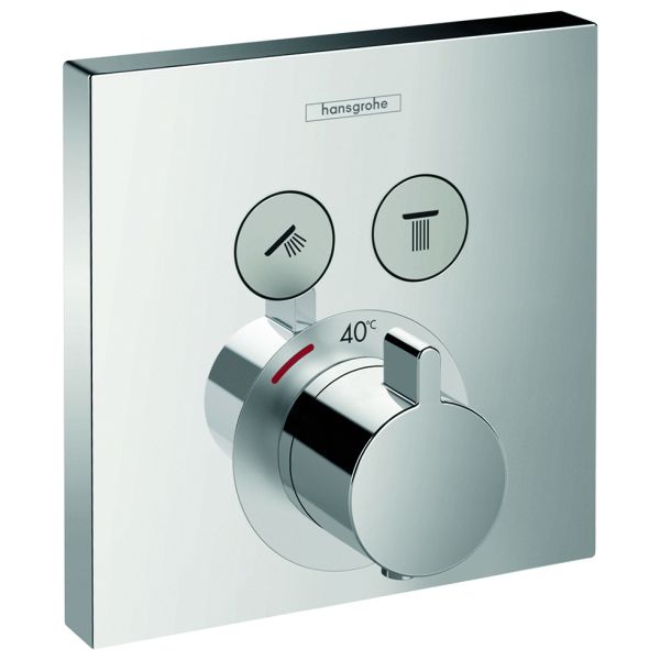 Hansgrohe ShowerSelect Ecostat är en förkromad termostatblandare för inbyggnad och består av handtag, hylsa, rosett, funktionsblock och knappar. Den har Select-tryckknapp (på/av) för 2 funktioner och det går att använda flera funktioner samtidigt. Termostatblandaren har en säkerhetsspärr vid 40°C.