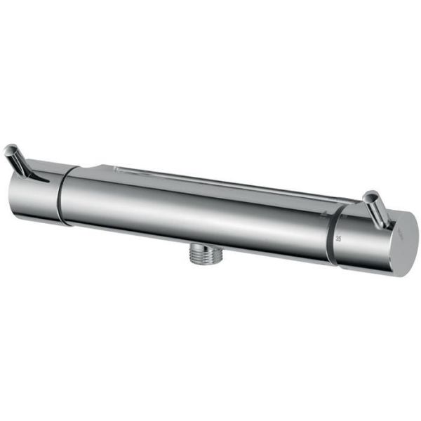 Art.nr: 2362613160 c/c duschblandare med duschanslutning nedåt. Blandaren kompenserar temperatur- och tryckvariationer och har en temperaturspärr vid 38° C.