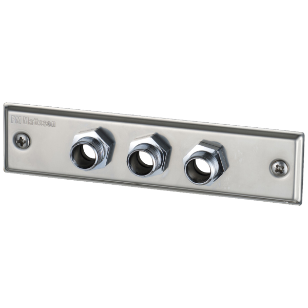 Typgodkänd väggbricka med väggtätning och lekande nipplar som är radiellt justerbara. Väggenomföring vid övergång från dold till synlig rördragning, rörskarven hamnar utanför vägglivet. Avsett för typgodkända rör 15 mm.