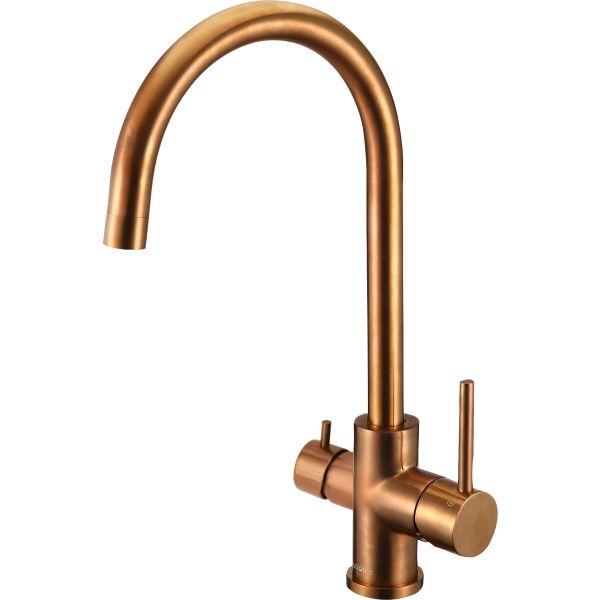 Engreppsblandare med 35 mm keramisk insats och hög svängbar U-pip. Pipen spärras till 120 grader genom att dra åt skruv på blandarens baksida. Vredet för diskmaskinsavstängning lutas åt sidan för att öppnas, vilket gör det tydligt om vattnet till diskmaskinen är på eller av. Anslutningsslangar i mjuk, metallomspunnen PEX (Ø 10x500 mm) medföljer. VA- och SINTEF-godkänd.