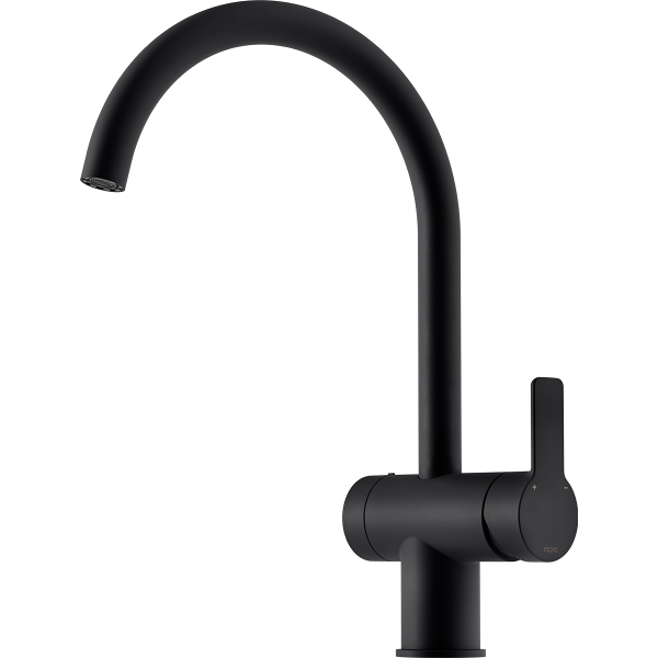 Tidlös, minimalistisk köksblandare i krom med diskmaskinsavstängning. Blandaren har en snygg, cylindrisk profil, en lätt krökt pip och en karismatisk platt spak.