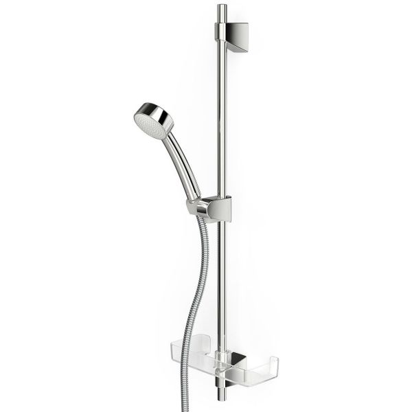 Oras Apollo duschset krom/grå, bestående av en handdusch, duschstång, duschslang och en tvålkopp. Enkel installation med flexibla väggfästen – max 720 mm.