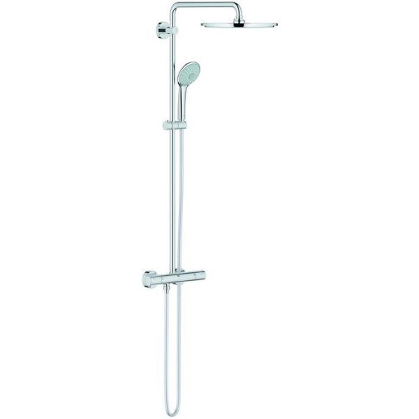Grohe Euphoria XXL 310 är ett duschsystem med termostatblandare för väggmontage. Duschsystemet har en huvuddusch med ± 15° vridningsvinkel och en handdusch med justerbar höjd. Utrustad med SafeStop vid 38 °C samt SafeStop Plus som ger en valfri extra temperaturbegränsare vid 43 °C. Delarna har förkromad Grohe StarLight-yta, samt SpeedClean antikalksystem som gör rengöringen enkel.