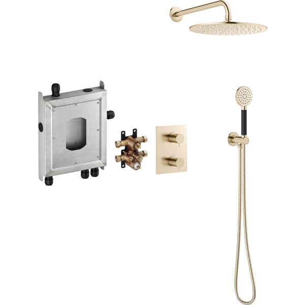 Art.nr: 4043564Takduschpaket med duschblandare för inbyggnad. Taksil (12 l/min) monteras på duschstång från vägg. Termostatblandare komplett för inbyggnad. Invändig del med omkastare.