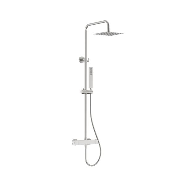 Temp och tryckstyrd duschtermostatblandare med takdusch och handdusch med PVC-fri slang. Justerbar i höjd och djupled.